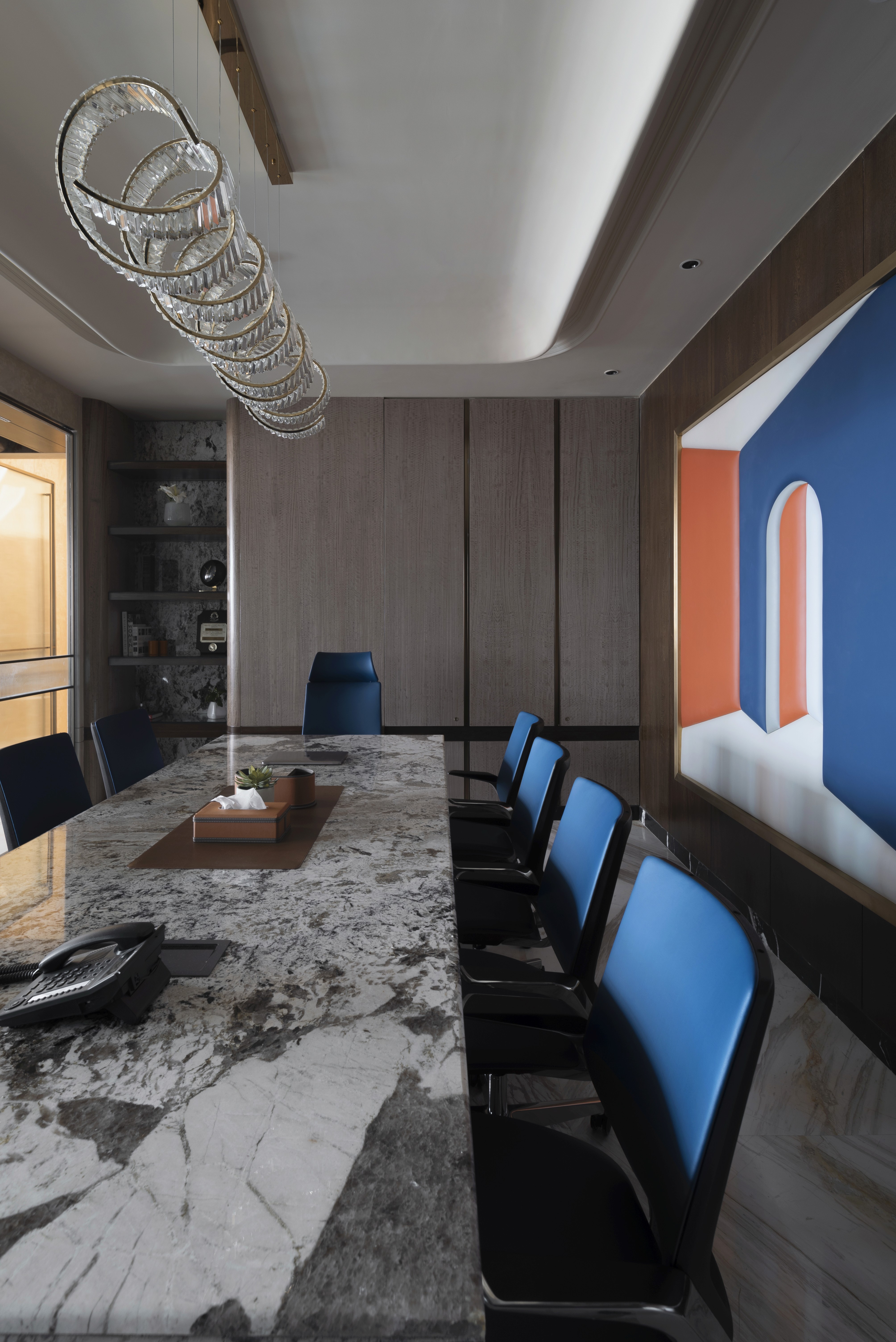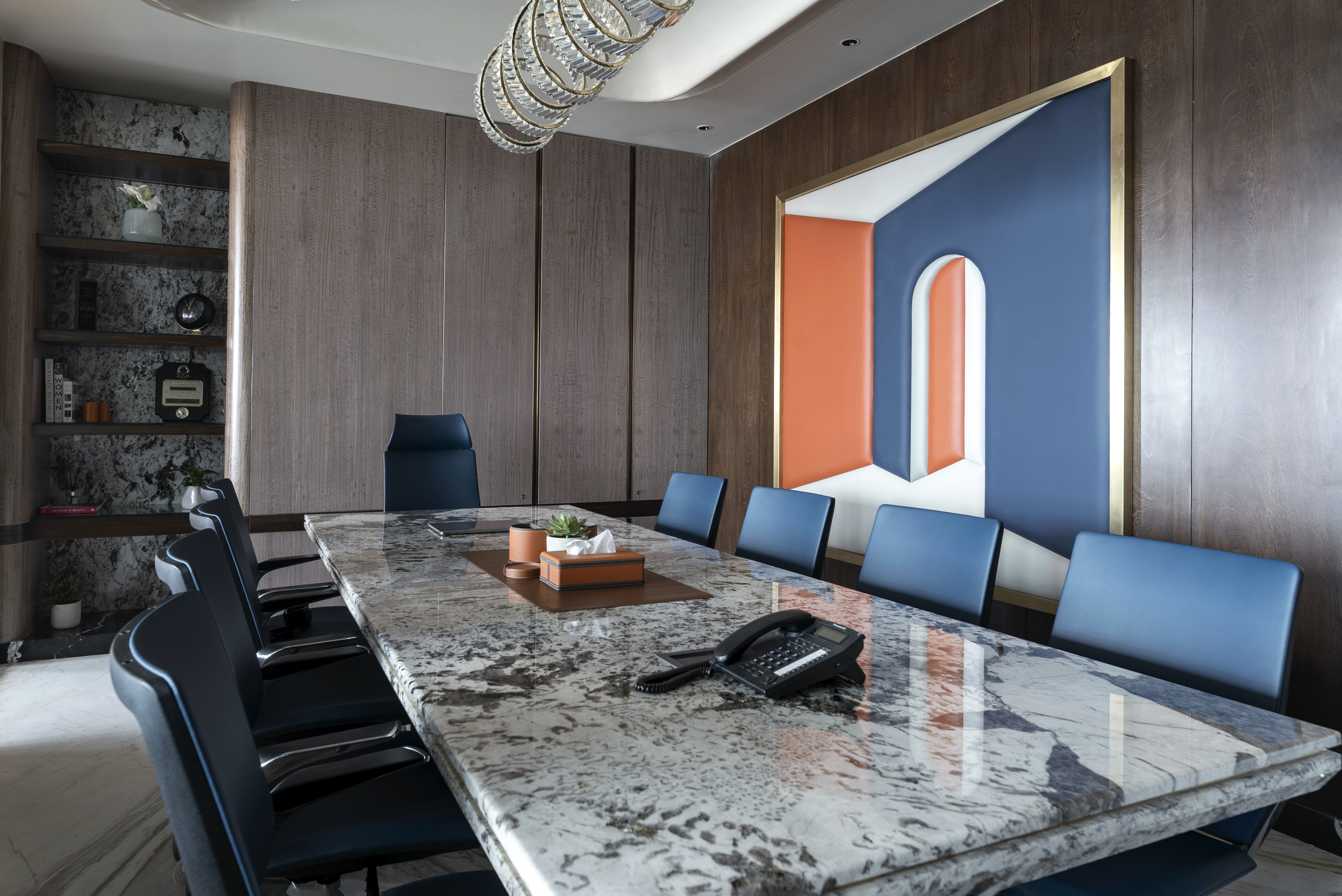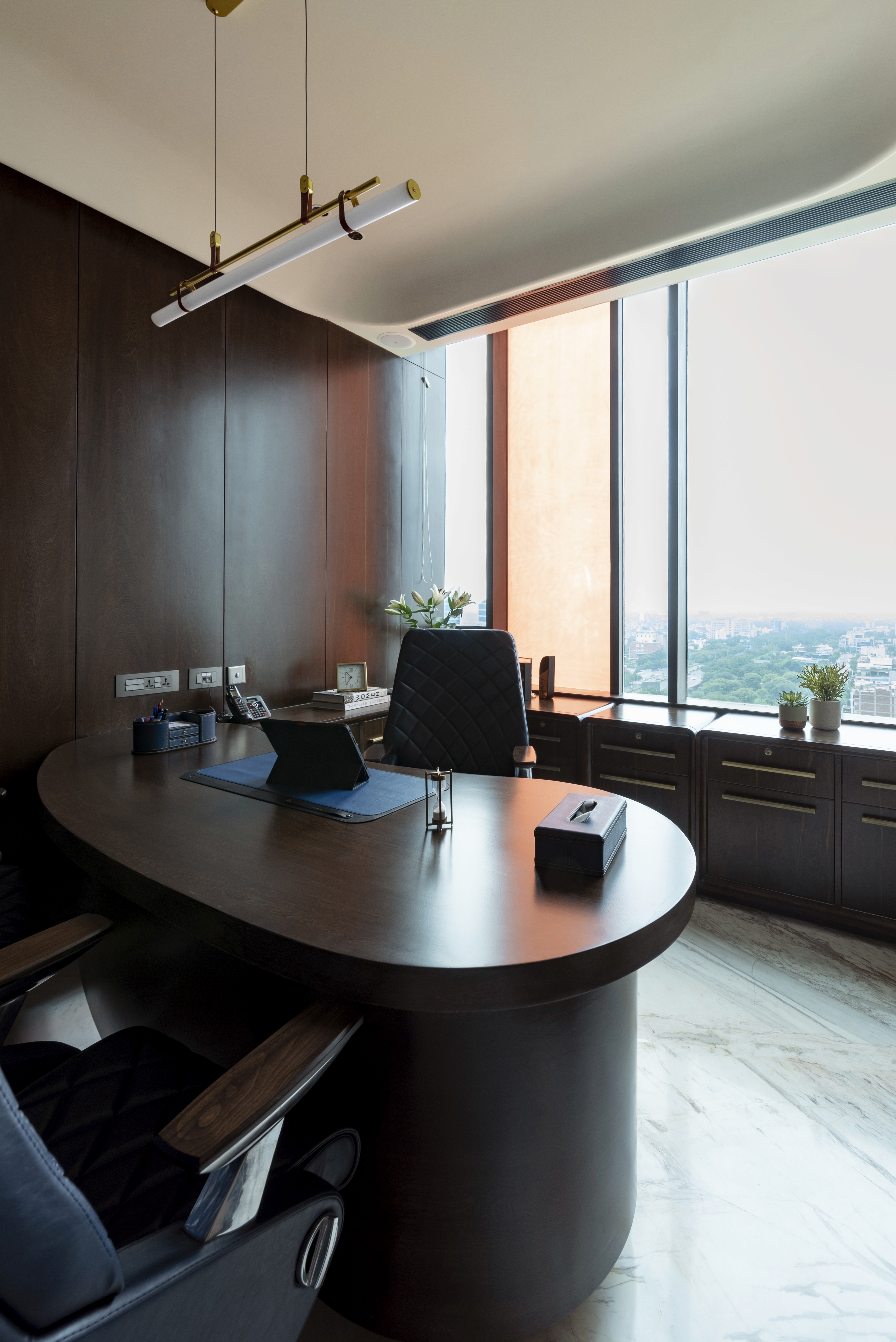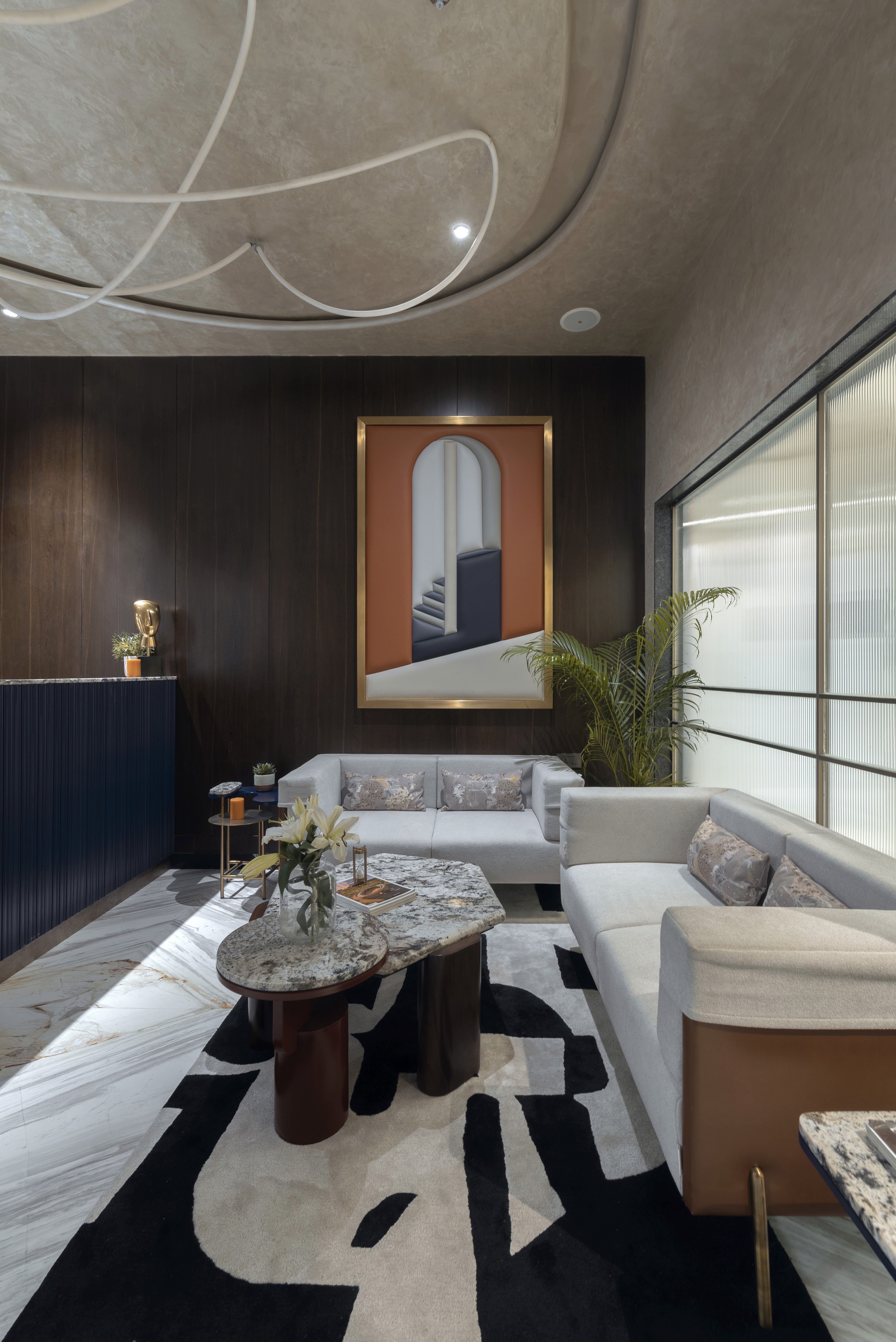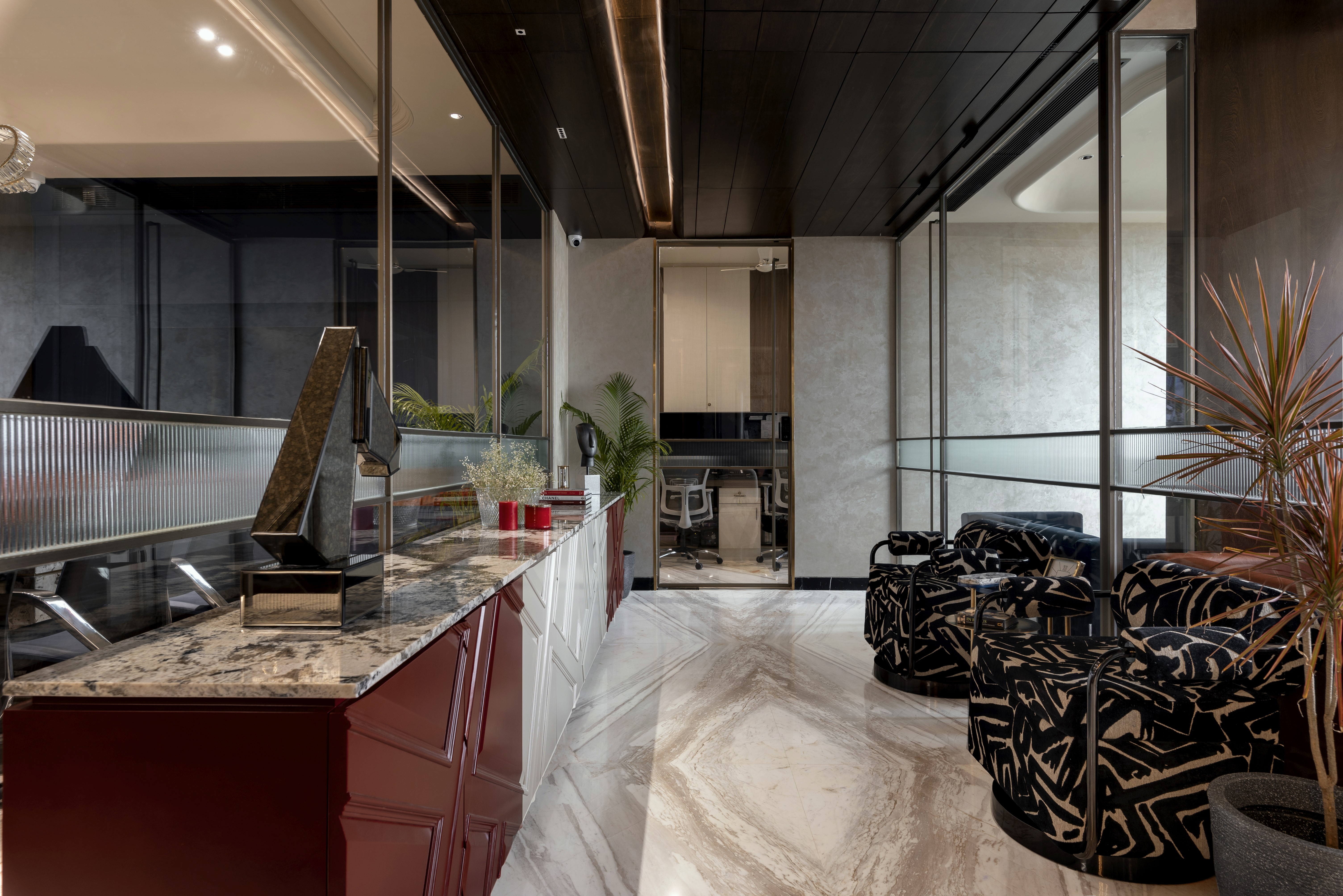 The planning is structured around a central circulation spine that connects reception, conference spaces, executive cabins, and open work areas. Glass partitions and fluted panels maintain visual continuity while subtly zoning functions, allowing natural light to permeate deep into the interiors. Storage is seamlessly integrated within wall systems and bespoke joinery, ensuring a clutter-free environment.