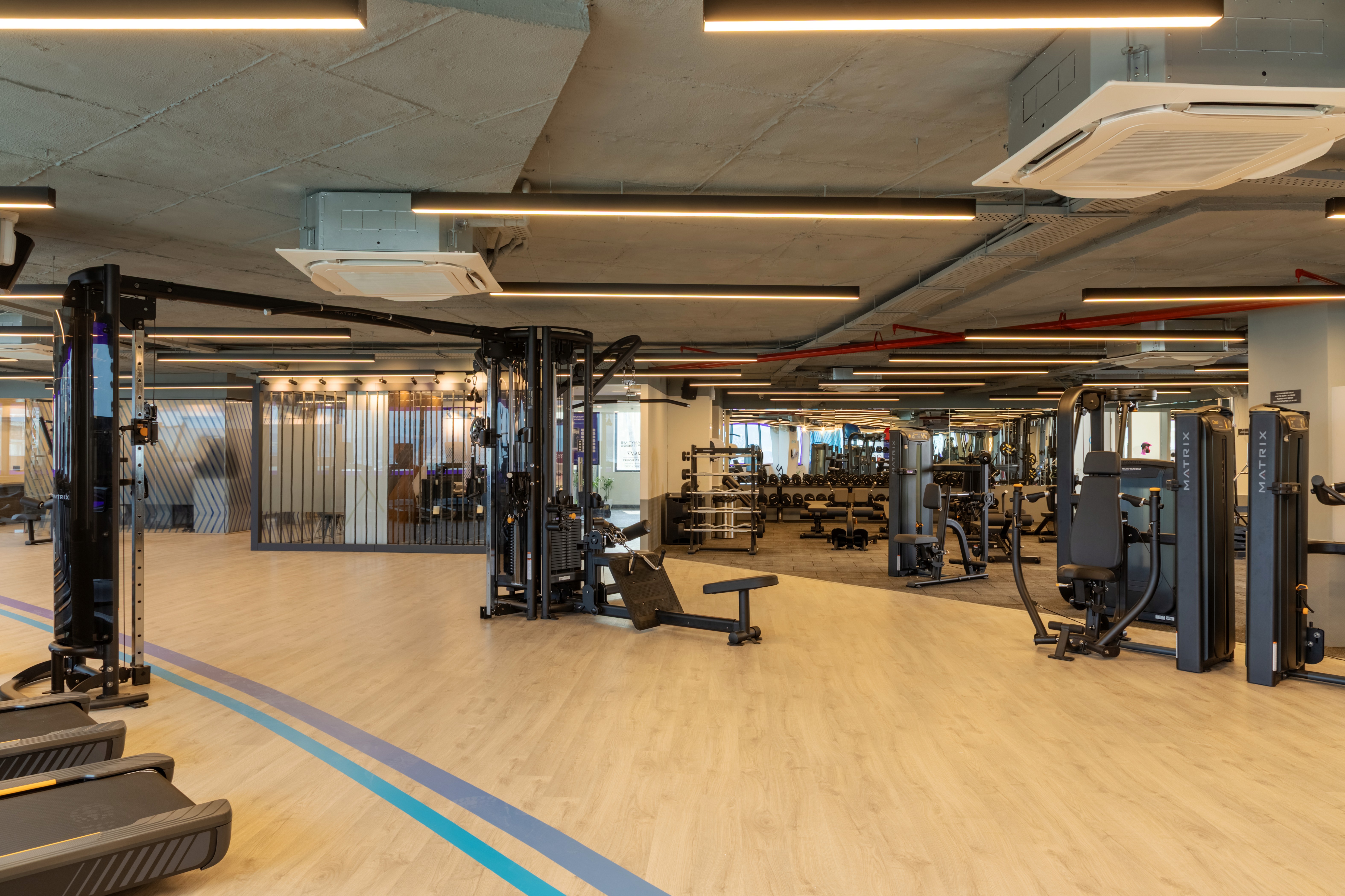 An exposed ceiling concept forms the core architectural language, revealing structural elements, services, and ducting while reinforcing the raw, industrial character of the space. Linear suspended lighting introduces rhythm across the ceiling plane, enhancing both visual clarity and workout functionality.