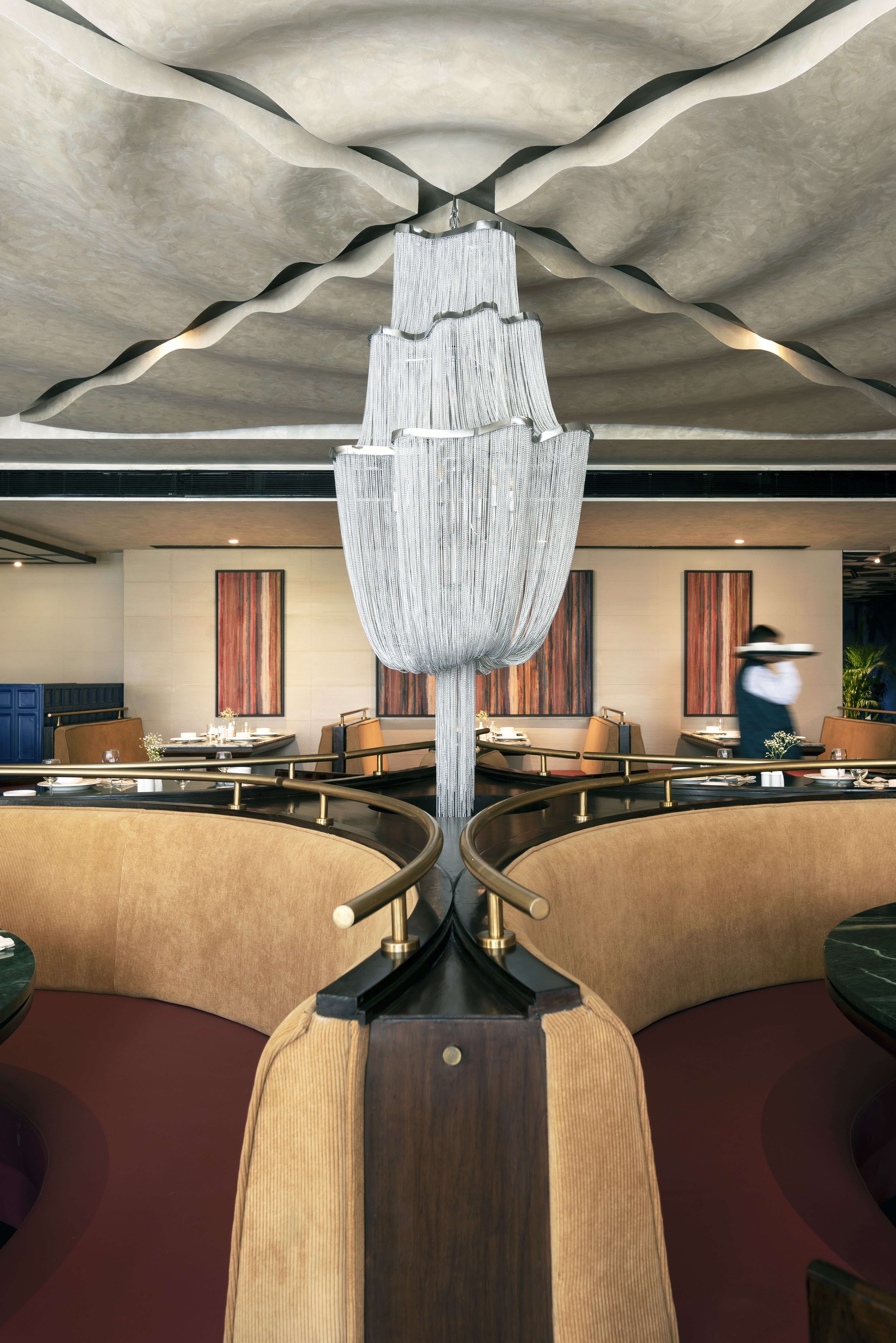 A vibrant palette of blues, yellows, reds, and greens is balanced with warm neutral surfaces, while handcrafted artwork, brass railings, and jharokha-inspired arches introduce subtle cultural references. Rippled ceiling details and a central chandelier create moments of drama without overwhelming the space.