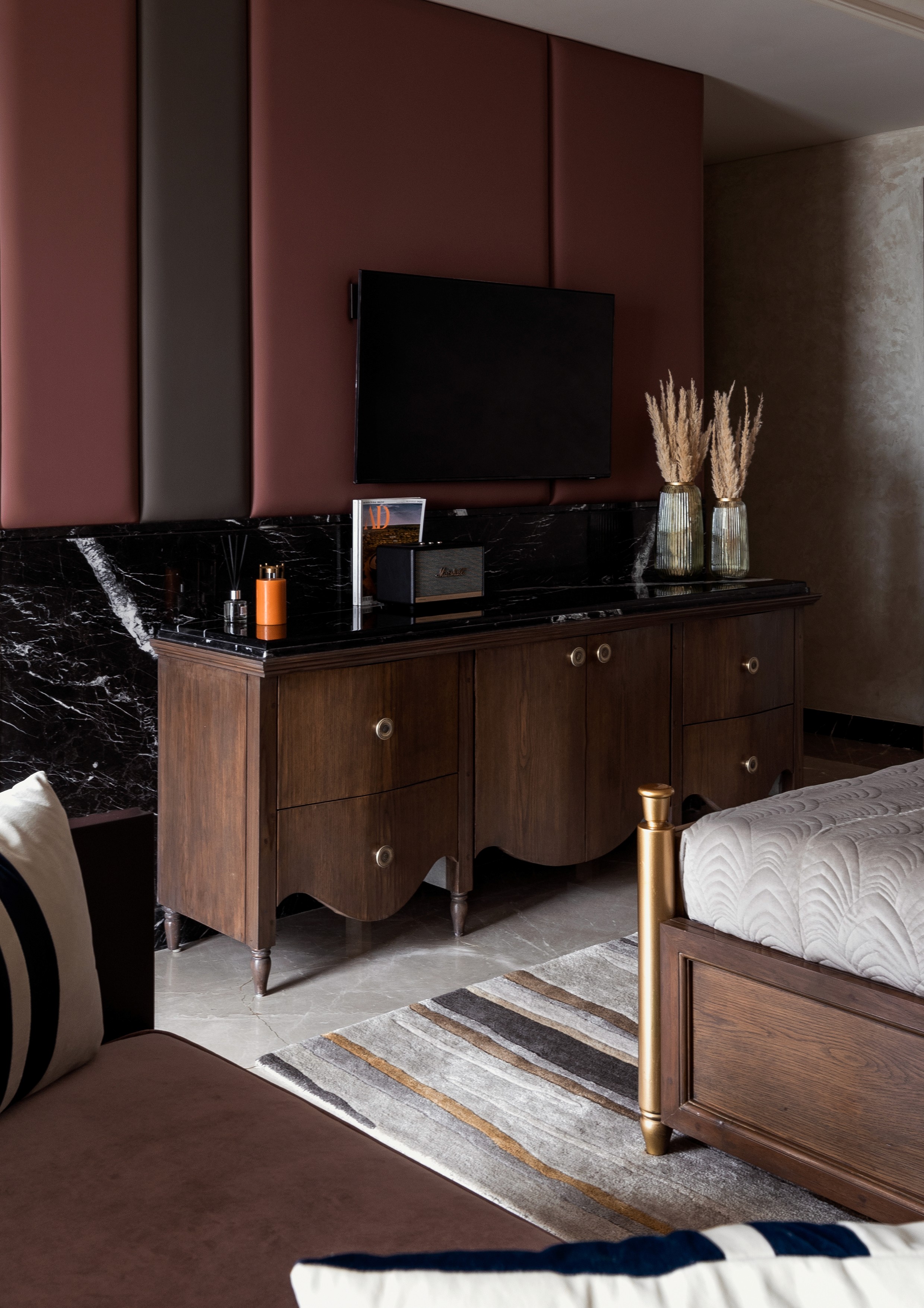 A refined material palette anchors the interiors — warm neutrals enriched with deep reds and blues, natural stone surfaces, and bespoke woodwork. Thoughtfully integrated lighting enhances volume and softness, responding sensitively to the constraints of low ceiling heights while maintaining spatial elegance.